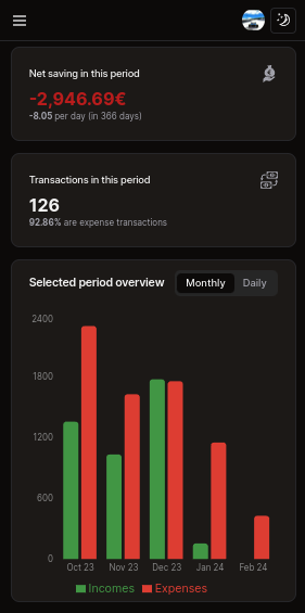 Get a quick overview of your finances with key performance indicators and visually engaging charts. See how your income and expenses stack up for a clear picture of your financial health.